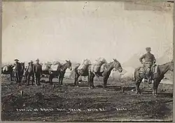 In the summer of 1856, Barter planned one of the biggest holdups during the gold rush.[3] The gang held up a mule train carrying gold bullion from the mines of Yreka, through the Trinity Mountains region. Since the mules were branded with the express company's name,[34] "WF" for Wells Fargo,[35] Barter and Cyrus stole mules and were to bring them to a meeting place. Meanwhile, the other four men and an unnamed Mexican man attacked the mule train on Trinity Mountain. They tied the guards up to trees and absconded with $80,000 of gold bullion (equivalent to $2,799,704 in 2024). The men then traveled to the pre-arranged meeting place, but Barter and Cyrus were not there.[34] George and the other men checked the trails and waited for Barter, Cyrus, and the unmarked mules.[35] On the third day of waiting, the Mexican man was nervous they would be caught and tried to leave, and George shot him out of fear he would tell others about the robbery.[36] George buried half the gold and rode out with the other half to Folsom where the three robbers hid the remaining $40,000 in gold. The men went to Phillips' Mountaineer House to see if there was information about what had happened to Barter and Cyrus. They were met by a posse and James Barkeley, a detective for Wells Fargo. George was killed instantly, Romero was seriously injured, and the other two men surrendered.[37][38] Romero and Newton were sentenced to ten years.[37][39] Carter turned over the $40,000 that was buried at Folsom and was pardoned. He left the life of crime, and died a poor man. The other $40,000 in gold, buried secretly by George, presumably remains hidden.[40] Barter and Cyrus were arrested for stealing mules and jailed in Auburn. The men escaped and separated. Cyrus was found near Auburn and ended up at the Angel Island penitentiary. Barter made it to San Francisco.[41][i]