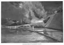 Hamilton served on board the U.S. Picket Boat No. 1, in action, 27 October 1864, against the Confederate ram Albemarle which had resisted repeated attacks by our steamers and had kept a large force of vessels employed in watching her. The picket boat, equipped with a spar torpedo, succeeded in passing the enemy pickets within 20 yards without being discovered and then made for the Albemarle under a full head of steam. Immediately taken under fire by the ram, the small boat plunged on, jumped the log boom which encircled the target and exploded its torpedo under the port bow of the ram. The picket boat was destroyed by enemy fire and almost the entire crew taken prisoner or lost.[1]