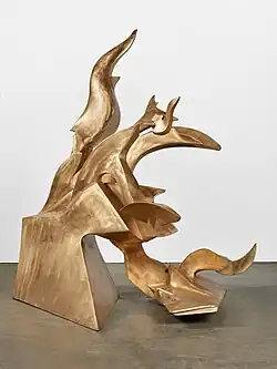 While studying at the School of the Art Institute of Chicago, Hunt focused his sculptural work on creating soldered wire figures, then on welding sculptures, as well as producing drawings, paintings, and lithographs.[17][11] The School of the Art Institute of Chicago did not have classes or materials suitable for learning welding, so he purchased his own welding equipment in 1955, and with little instruction, taught himself to weld in the basement studio of his father’s barbershop.[19] Interested in Modernism, Abstract Expressionism, and Surrealism, he experimented with the assemblage of broken machine parts, car bumpers, and metals from the junkyard reshaping them into organic forms.[20] Hunt went on to work with iron, steel, copper, and aluminum producing a series of "hybrid figures", references to human, animal, and plant forms.[21] Hunt explored the interplay of organic and industrial subject matter in his artwork. His earliest works, which often represented classical themes, are more figurative than his later works.[12]