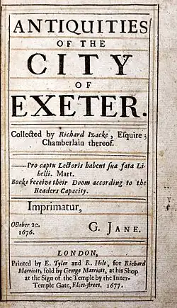 - ^ For example, the title of the 1724 second edition is: Remarkable Antiquities of the City of Exeter: Giving an account of The Laws and Customs of the Place; the Offices, Court of Judicature, Gates, Walls, Rivers, Churches and Immunities; the Titles and Privileges of the Several Corporations and their distinct Coats of Arms finely engraven on Copper-Plates: with a Catalogue of all the Bishops, Mayors, and Sheriffs, from the year 1049, to 1677.[3]