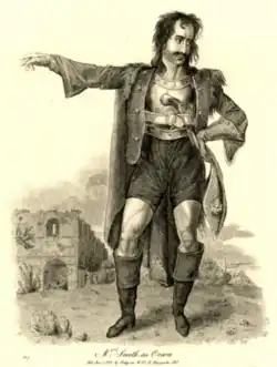His performance as Robert in the pantomime of Raymond and Agnes attracted the attention of Robert William Elliston, who engaged him in 1810 for the pantomime at the Surrey Theatre. Taking in Bombastes Furioso the part of Bombastes, vacated through illness by another actor, he gave an exhibition of intensity such as established his position in burlesque. A performance of 'Obi' in the melodrama of Three-fingered Jack (1819) got him his sobriquet of 'O' (otherwise Obi) Smith.[3] In 1813 Smith accompanied Elliston to the Olympic Theatre, where he played Mandeville in the False Friend, a rôle in which Edmund Kean was to have appeared. After acting at the Lyceum Theatre, he is said to have been engaged in 1823 at the Theatre Royal, Drury Lane, at which house he had previously been seen in pantomime. He also seems to have played at the Royal Opera House in Covent Garden. His performance in the Bottle Imp at the Lyceum Theatre attracted attention, leading him to complain, but half in jest: "For the last five years of my life I have played nothing but demons, devils, monsters, and assassins, and this line of business, however amusing it may be to the public or profitable to managers, has proved totally destructive of my peace of mind, detrimental to my interests, and injurious to my health. I find myself banished from all respectable society; what man will receive the Devil upon friendly terms, or introduce a demon into his family circle? My infernal reputation follows me everywhere". A writer in the Monthly Magazine declared him "eminent in assassins, sorcerers, the moss-trooping heroes in Sir Walter Scott's poems, and other wild, gloomy, and ominous characters in which a bold, or rather a gigantic figure, and deep sepulchral voice could be turned to good account." Smith had, however, some control over tenderness, his performance at the Lyceum, in the Cornish Miners, of a maniac who visits the grave of his dead child, being very pathetic. At Drury Lane he was, on 10 November 1824, the first Zamiel in Soane's version of Der Freischütz.
