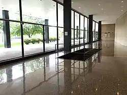 The split entrances occur near the entry points of the two back-to-back lecture halls, each seating roughly 250.[3] The interior spaces on the ground floor have exposed buff brick walls, the same as the exterior. The internal two fan shaped lecture halls, form a core with buff brick walls on the sides and curved wood walls on the ends. The floors on the first floor are a tan terrazzo. The interior finishes are not as luxurious in the upper three floors. These upper floors have do have the exposed brick interior walls, but the floors are black tile and the lighting is not recessed and smooth in with the ceiling plane.