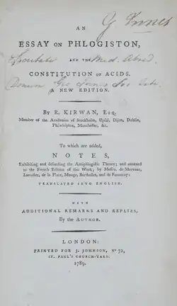 Kirwan was one of the last supporters in Britain and Ireland of the theory of phlogiston, for which he contended in his Essay on Phlogiston and the Constitution of Acids (1787), identifying phlogiston with hydrogen. This work, translated by Marie-Anne Pierette Paulze, was published in French with critical notes by Lavoisier and some of his associates. Kirwan attempted to refute their arguments, but they proved too strong for him, and he acknowledged himself a convert in 1791.