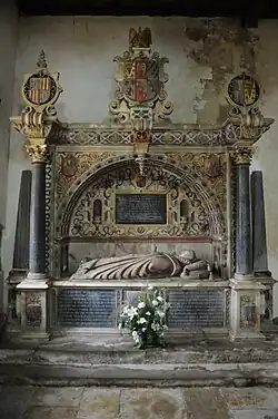 - Secondly to Lady Elizabeth Seymour (d.1602), a daughter of Edward Seymour, 1st Duke of Somerset, by whom he had seven sons and seven daughters. Her portrait was painted by Marcus Gheeraerts the Younger including the Seymour phoenix badge.[10][11] Her monument with effigy survives in All Saints Church, Norton, Northamptonshire. His son and heir, Valentine, and a grandson, Richard, were also Members of Parliament.
