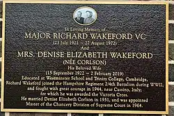 A memorial plaque in honour of Major Richard Wakeford VC and Mrs. Denise Elizabeth Wakeford was erected at Leatherhead Randalls Park Crematorium, Surrey, England in 2019.