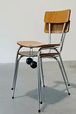 In the early 1980s, Wentworth became identified with the New British Sculpture movement. Wentworth's interest is the juxtaposition of materials and found elements that do not belong together.[1] In the work Shower, Wentworth attached a small propeller to an ordinary table, creating the impression that the furniture is about to take flight. For his 1995 solo show at the Lisson Gallery, he created False Ceiling, a flock of books suspended by wire from the gallery's ceiling.[1] For Art and Sacred Places in Winchester Cathedral, he created Recall, which speculated how the structure of the Cathedral might have been supported during its construction. Wentworth is also interested in the coincidences of urban life. His ongoing series of photographs, Making Do and Getting By (1974 onwards), captures the ways in which people modify their local environment. In April 2010, Wentworth participated in a sculpture exhibition curated by Peter Kardia entitled "From Floor to Sky," alongside artists Roderick Coyne and Alison Wilding.