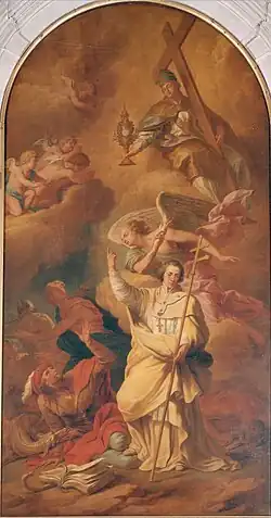 Richard van Orley created a series of paintings on the life of Saint Norbert for Tongerlo Abbey, only one of which survives (Royal Museum of Fine Arts Antwerp).[7] He created another series of four religious compositions on the same theme for Grimbergen Abbey. He also painted a Portrait of abbot Augustinus Willem Van Eeckhout who commissioned this series.[8]