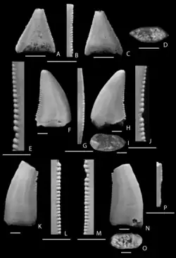 In 2001, Julia Sankey named a second species: Richardoestesia isosceles, based on a tooth, LSUMGS 489:6238, from the Texan Aguja Formation, which is of a longer and less recurved type.[6] The teeth of R. isosceles have also been identified as crocodyliform in shape, possibly belonging to a sebecosuchian.[7]