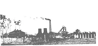 In 1914 9,830 tonnes (9,670 long tons) of coal was produced. The mine workings had been opened out enough to allow the installation of seven Ingersoll Rand compressed air coal cutters. In 1915-15 the elevated gantry from the main shaft pit top building to the screens buildings, along with the screening buildings and equipment, along with the rail sidings were under construction.[15] Whilst the mine was nearing completion it was plagued by industrial action by the miners and only produced 1,500 tonnes (1,500 long tons) of coal during 1916. During 1916 the locomotive shed and the 3,000 tonnes (3,000 long tons) small coal bin were built.[16] The pit top and screening plant was completed by June 1917.[15] In February 1917 the miners had returned from strike and in the period up to August 1917 the mine had produced 7,000 tonnes (6,900 long tons) of coal. However, from August 1917 through to early 1918 the mine was plagued by industrial action. For the remained of 1918 the mine was in full production and produced 170,000 tonnes (167,000 long tons) of coal.[17]