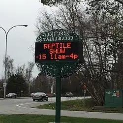 The Richmond Nature House in Richmond Nature Park is an interpretive centre for visitors to learn more about the park through interactive displays, games, and resources.[6] The Nature House also offers a gift shop, trail guide information, and exhibits including an active beehive and a reptile show, and a collection of live animals to educate visitors about the bog.[6][7] Admission into the Nature House is by donation.[8]
