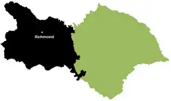 At the terminus of Scandinavian York, there was a local bout of rebellion in Stainmore, which resulted in the death of Eric Bloodaxe. The Scandinavian settlement of this area was eastwards from the Irish Sea with names such as Gilpatrick in Middleham and Thorfinn in Bedale occurring at the time of the Domesday Book. At the time of the Norman Conquest it was the Fee of Gillingshire, held by Edwin, Earl of Mercia.[4] Gillingshire[5] It was made up of the Borough of Richmond and the five wapentakes of Gilling West, Gilling East, Hang West, Hang East and Hallikeld.[6]