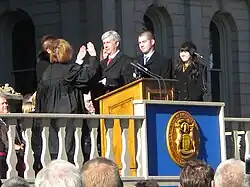 In August 2010, Snyder won the primary to secure the Republican nomination with a plurality of 36% of the vote. In the general election in November, Snyder faced Democratic nominee Virg Bernero, the mayor of Lansing, and three minor party candidates. In October 2010, Snyder's campaign total exceeded $11.6 million, outpacing his opponent.[40] Snyder released his tax returns for 2007 and 2008.[41] Snyder won with 58% of the vote.[42] With Snyder's election in 2010, Republicans gained a majority in the Michigan House and increased the Republican majority held in the Michigan Senate. Snyder was the first Certified Public Accountant (CPA) to be elected governor of the state and at the time, the only CPA to serve as a governor in the United States.[43]