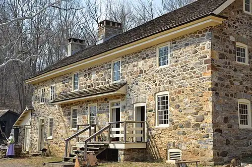 Prior to European settlement, the Ridley Creek State Park area was home to the Lenni Lenape.[5][4] The area was originally settled by English Quakers and remained agrarian into the twentieth century. The oldest property is the 1683 Worrel House.[6] In 1718 a water mill, then known as Providence Mill, began to grind corn. In the late 18th century a plaster mill was established next to the grist mill. A rolling and slitting mill replaced the plaster mill by 1812, and became known as Bishop's Mills. Workers cottages, a dam, and several outbuildings complete the mill complex, now known as Sycamore Mills.[7] The mills operated until 1901, when they were damaged by fire.[8]
