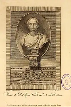 Venuti took his doctorate in civil and canon law in Rome, where he joined the entourage of Cardinal Alessandro Albani; he also began to study Classical art.[2] His Collectanea antiquitatum romanarum (folio, 1736) was the first fruit of his Roman sojourn and of his friendship with other scholars and antiquaries, such as Antonio Francesco Gori, whose pupil he declared himself to be.[2] This work, a catalogue of the collection of Antonio Borioni, was divided into 100 descriptive tables listing the objects represented in 100 corresponding engravings.