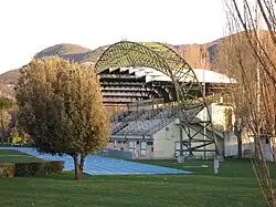 The city centre of Rieti as seen from San Mauro hill, east of the city. In the background, the Rieti valley enclosed by the Sabine mountains; in the foreground, the Velino river. | |