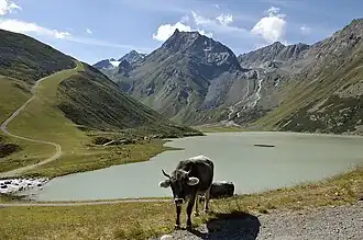 Rifflsee is a lake of Tyrol, Austria.[2] It is the largest lake in the Ötztal Alps. The mountain lake is located in the Kaunergrat west of the Pitztal and is a typical moraine reservoir. The lake fills an extensive valley, the glacier-turbid water looks greenish. It is framed in the north and west by rugged peaks of the Kaunergrat, particularly striking are Seekogel and Rostizkogel. In sunny and warm weather, a considerable amount of melt water is supplied by the Seekarles, Loch, and Rifflferner.