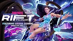 The Rift Tour was a virtual concert event by Ariana Grande, held on the video game Fortnite Battle Royale.[1][2][3][4][5] The show was played five times between August 6 and 8, 2021. Grande described the tour as "…an unforgettable, magical journey to new realities.”[1] During the tour, players were able to purchase a skin of Grande and other cosmetic features inspired by the event to play as her in-game.[2][6] Other artists, including Travis Scott and Marshmello previously held concerts in Fortnite as well,[7][8] but Grande's was the first to tie in to multiple aspects of the game.[2][4] Three minigames took place before the concert began, each with their own song: "Come & Go" by Juice Wrld and Marshmello, "Audio" by LSD, and "Victorious" by Wolfmother[9]