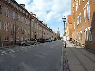 Rigensgade originates in the 1649 plan for New Copenhagen, the large area which was included in the fortified city when the old East Rampart along present day Gothersgade was decommissioned and a new one was built in a more northerly direction. According to the plan, the streets in the area were to be named after Danish territorial possessions, royalty and the upper classes.[1] The shape of the Nyboder development indicates that the original intention was to create a street parallel to Adelgade and Borgergade at the site.