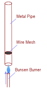 A simple construction of the Rijke tube, with a wire mesh in the lower half of a vertical metal pipe. The tube is suspended over a bunsen burner.