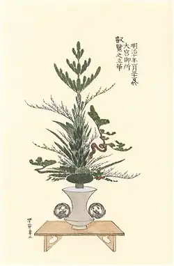 The term came to be a popular synonym for ikebana in the 15th century, when rikka became a distinctive element of interior decoration in the reception rooms at the residences of the military leaders, nobility, and priests of the time.[2] It enjoyed a revival in the 17th century, and was used as a decorative technique for ceremonial and festive occasions.