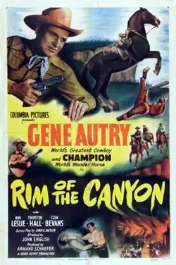 Rim of the Canyon is a 1949 American Western film directed by John English and starring and co-produced by Gene Autry; featuring Nan Leslie, and Thurston Hall. Based on the short story Phantom .45's Talk Loud by Joseph Chadwick, the film is about a horse stolen by escaped convicts and the cowboy who pursues them to a ghost town inhabited by a ghost.[1]