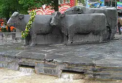 The fountain is crowned by a powerful set of bronzeworks above the steps. It shows three cattle which look down from their position onto people resting at the base of the fountain. Slightly aside is the stone figure of an observing herdsman sitting on a retaining wall.