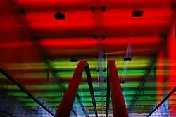 The Nydalen district, formerly an industrial area, has since undergone urban redevelopment. The immediate vicinity of the station includes several large workplaces. In 2005, BI, with 8000 students and faculty, moved into a new campus across the street from Nydalen Station.[13] Nydalen is the only underground station on the Ring Line. The escalators leading down to the platform features The Tunnel of Light, an artistic presentation of sound and colour around the passengers as they ascend from or to descend to the station. The artwork contains 1800 lights and 44 speakers. Nydalen also serves as a bus hub.[21]