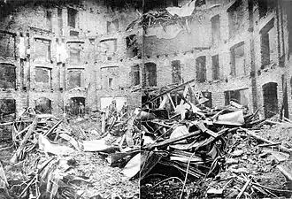 Given that the footprint of the theatre was small—and the theatre was intended to hold an audience of 1700—the architect was forced to build high, but with disastrous consequences. On December 8, 1881, a fire broke out due to a problem with the gas lighting system, shortly before a performance of Les contes d'Hoffmann,[1] and at least 384 people were killed.[2] The following year, a new law was passed, regarding the outfitting and safety provisions, including safety curtains, outward-opening doors, and fireproofing of the set.