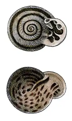 The adult snails in this genus carry their shells upside down, with the spire or apex at the bottom, and the umbilicus at the top.[1]