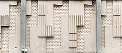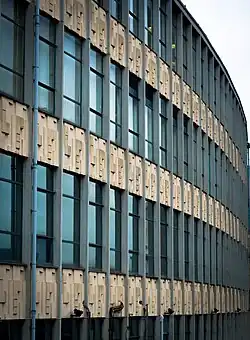 The façade of the building has a blend of thin concrete mullions, bands of windows and relief panels.[2] The pre-cast abstract geometric relief panels are similar in form to the works of Ben Nicholson. There are projecting sculptural concrete trough uplighters which highlight the relief panels at night.[2] In the centre a glazed section bridges Hurst Street on a pair of ribbed splayed concrete piloti, the building was carried over Hurst Street to ensure the continuous sweep of the building along the south side of the road.[2][7]