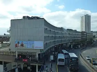 In 1940 during World War II most of the buildings on the south side of Smallbrook Street were destroyed by German bombing, including the Frank Matcham designed Empire Palace Theatre of 1894 on the corner of Smallbrook Street and Hurst Street.[4] A few buildings survived the Birmingham Blitz, most notably the Scala Cinema which stood at the western end of the Ringway until its demolition in 1960 for the construction of Scala House.[5] From 1940 until 1957 the areas to the south of Smallbrook Street were used for car parks and temporary second hand car dealerships, and the remaining buildings were demolished in 1957.[3]