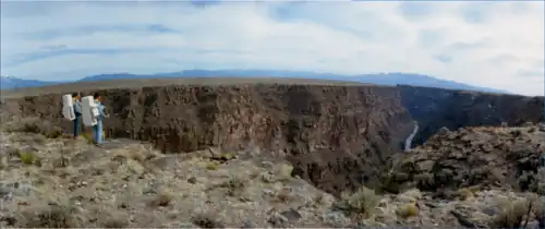 The Rio Grande Gorge is a geological feature in northern New Mexico where the watercourse of the Rio Grande follows an eroded chasm. Beginning near the Colorado border, the approximately 50-mile (80 km) gorge runs from northwest to southwest of Taos, New Mexico, through the basalt flows of the Taos Plateau volcanic field. The gorge depth is 800 feet (240 m) just south of the Rio Grande Gorge Bridge, which spans the gorge 10 miles (16 km) northwest of Taos.