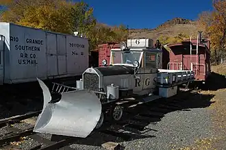 Rio Grande Southern Railroad (RGS), Motor Number 6 (affectionately nicknamed Galloping Goose Number 6) is a gasoline engine powered narrow gauge railroad motor car. The Galloping Goose body and chassis were built from a Buick automobile. The new Buick body was cut off behind the front seat and a new rear wall installed. The steering wheel was removed as it was not needed, but the other controls remained. The front axle was removed and replaced with a swiveling two axle lightweight railroad truck with sixteen inch diameter wheels that carried and guided the front of the Goose. Ahead of the front truck is the pilot (cow catcher) attached to the frame. Two small pivoted scrapers attached to the rear of the pilot slide on the rails to keep small objects on the track from derailing the lightweight front truck. During the winter season a small snow plow (now stored on the car's flatbed) was attached to the front of the pilot.[2] The rear of the car frame was lengthened using steel channel riveted together but welded to the frame to carry the truck type flat-bed platform. The bed has short stake racks around the sides to keep materials from falling off.[2] The Goose was originally powered by the 6-cylinder engine, clutch and transmission that came with the Buick. The drive chain powers the rear swiveling two axle truck assembly mounted under the rear frame and platform bed. The drive shaft turns only the forward axle. The rearmost axle is driven by roller chains and sprockets mounted outside of the wheels on each side. The rear truck has twenty four-inch diameter cast wheels. The braking is accomplished by brake shoes between the axles on each truck being pushed against the wheel treads. These are actuated by linkage connecting them to the normal foot pedal and parking brake lever. The foot brake is connected to the front truck and the parking brake lever is connected to the rear truck. Goose No. 6 received air brakes about 1939.[2] The paint colors of Goose No. 6 early on is still an item of much discussion. Examination of the paint layers on the rear bed revealed only black and then aluminum that was used after 1935.[2]