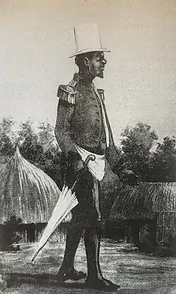 The indigenous people were split into two groups ever since the death of the king of the Landoumas in late 1846, who occupied the upper section of the river beyond Rapass (or Ropaz). One group supported Tongo who was also the Britain's choice (at the beginning), and another supported Mayoré, his brother, and was supported by France (at the beginning). Mayoré had also gained the support of the Nalous, who had pledged their armed support.[3] That angered Tongo, who set fire to Walkaria but was beaten by Joura, the brother of Lamina, King of the Nalous, and was forced to retreat inland. The proxy war led to a treaty between France and Britain that forbade either party from intervening on the river.[3] Van Haverbeke, the Belgian commanding officer, seized the opportunity by signing a convention with Lamina where the latter ceded to the King of the Belgians both sides of the Rio Nunez, up to one mile inland, from the backwater upstream of Rapass to the backwater downstream of Victoria.[3] Against regular payments by the Belgians, he would also provide them with protection.[3] The Louise-Marie then sailed to Belgium and back down to the Rio Nunez to bring the treaty that was to be ratified.[3] Meanwhile, Cohen was to be in charge of commerce in the region.[3] Their return was not well received by the French regional commander, Édouard Bouët-Willaumez, who thought the river to be very important to France and was unhappy to have been ordered by his government to protect the Belgian at all cost.[3] On 11 February 1849, Lamina came aboard the schooner and received to his great pleasure his uniform complete with epaulettes from the Belgians.[3]