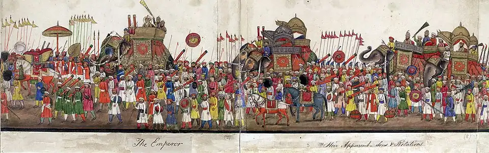 The Mughal Empire, founded by Babur, a direct descendant of Timur and Genghis Khan, was able to conquer almost the entirety of South Asia. Although religious tolerance was seen during the rule of emperor Akbar's, the reign under emperor Aurangzeb witnessed the full establishment of Islamic sharia and the re-introduction of Jizya (a special tax imposed upon non-Muslims) through the compilation of the Fatawa-e-Alamgiri.[71][72] The Mughals, already suffering a gradual decline in the early 18th century, was invaded by the Afsharid ruler Nader Shah.[73] The Mughal decline provided opportunities for the Maratha Empire, Sikh Empire, Mysore Kingdom, Nawabs of Bengal and Murshidabad and Nizams of Hyderabad to exercise control over large regions of the Indian subcontinent.[74] Eventually, after numerous wars sapped its strength, the Mughal Empire was broken into smaller powers like Shia Nawab of Bengal, the Nawab of Awadh, the Nizam of Hyderabad, and the Kingdom of Mysore, which became the major Asian economic and military power on the Indian subcontinent.