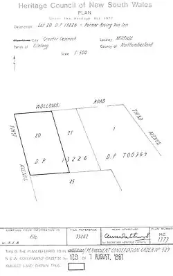 A rare example of a vernacular slab built inn, part of which dates from the early nineteenth century, which served travellers on the Great North Road from Wollombi to Maitland. It provides evidence of the importance of the Great North Road and to the opening up of the Hunter Valley. The house dates from c. 1838 and retains fabric from that date, and from all of its later additions reflecting its varied history as an inn, general store, post office and residence. It has associations with pioneering families in the Wollombi-Maitland area and many of its licensees also held licences for other Inns in the region. It has significant scenic value, being sited on the main road at the top of a rise leading down to Wollombi Brook. One of the most important early buildings in the City of Cessnock.[2][6][1]