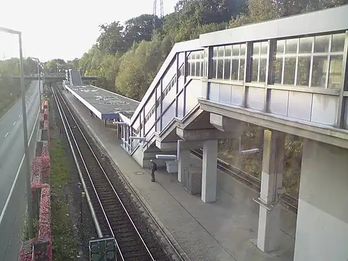 When the steam railway line to Wedel was opened on 1 December 1883, also a station in the small village of Rissen was established. It was then also used for freight traffic and had 3 tracks, the third of which was a siding south of the two platform tracks, which was later removed. Electrification of the line to Wedel was completed on 20 May 1954.[5] In May 1983 the new Rissen station opened next to the new Bundesstraße (federal road) 431 in a terrain cutting soon dubbed by the inhabitants as "Rissen Canyon". The old station, a small building similar to the Sülldorf station, had to be demolished afterwards in order to complete the cutting with the new federal road.