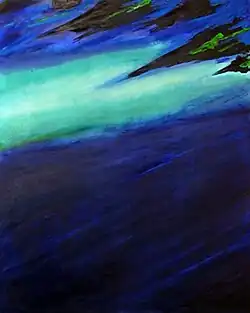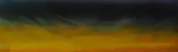 The couple left Los Angeles in 1969, alternating their time between New York and Toronto (which would continue until 1975)[15] when Toronto became her centre, the demand for her work increased. In New York, galleries were purchasing entire series' of 100 prints outright.[8] One day in 1971 someone suggested she might obtain a better effect on her long lines/rays if she used an airbrush; hesitant at first, she began using it more, then eventually used it all of the time. She found that airbrush brought her something new, something that neither oil, nor acrylic, nor the millions of lines she had made in the 1970s had succeeded in bringing her.[8] The popularity of her work continued with many public and private commissions for large scale works and murals including one covering the top six stories of the Neill-Wycik college residence at Ryerson University in Toronto, the first of its kind in Canada. She was also commissioned to design a huge coloured skylight for the ceiling of Glencairn (TTC) subway station in Toronto entitled Joy; it was eventually removed at Letendre’s request because the panels had faded after being exposed to many years of sunlight.[16] However, "Joy" was reengineered and reinstalled in Glencarin Station in 2014 and cast a warm, orange glow over commuters to this day [17] In the early 1970s, she began to soften some of the edges in her works,[14] a trend that would continue the next few years; this resulted in a myriad of horizontal landscape compositions often containing a few or even only one thin hard edge line.
