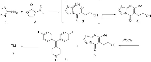Aminothiazole (2-thiazolamine) (1) is condensed with 2-acetylbutyrolactone [517-23-7] (2) under DS-trap until the water has separated. Condensation of this β-keto lactone can be visualized to involve initial attack on the reactive butyrolactone by the primary nitrogen; cyclodehydration of that hypothetical intermediate 3 gives 6-(2-hydroxyethyl)-7-methyl-[1,3]thiazolo[3,2-a]pyrimidin-5-one, CID:82612453 (4). Halogenation of the terminal alcohol with phosphorus oxychloride then yields 6-(2-chloroethyl)- 7-methyl-5H-thiazolo[3,2-a]pyrimidin-5-one, [86488-00-8] (5). Alkylation with 4-(bis(4-fluorophenyl)methylene)piperidine, [58113-36-3] (6) would complete the synthesis of ritanserin (7).