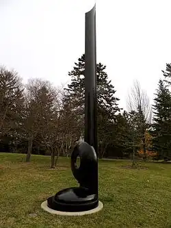 The sculpture consists of a black monolith set on a circular base. Near the shaft's base is a circular form. [2]