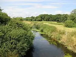 The western Adur rises at Slinfold, from where it flows around Coolham and then through Shipley, where Hammer Pond and Lancing Brook join it on the right bank.[3] On the left bank, it is joined by the outflow of Knepphill Pond, which forms part of the Knepp Castle pleasure grounds laid out by John Nash in 1806–13. He designed the present castellated mansion known as Knepp Castle for Sir Charles Merrick Burrell, but the grounds include the remains of an 11th-century castle, known by the same name, which was demolished in 1726. The pond was constructed as a hammer pond for the iron industry in the 16th century by the Duke of Norfolk.[4] At Bay Bridge it is crossed by the A24 road, is joined by another tributary on the left bank, and flows on to West Grinstead, passing through the remains of a lock. It is joined by Blakes Gill just above Hatterell Bridge, where it passes through a large weir structure. There are the remains of another lock at Lock Bridge, Partridge Green, and Honeybridge Stream joins it on the right bank. Near Bines Green, Bines Bridge carries the B2135 road over the river, and the river is tidal below this point. Soon afterwards, it joins the eastern Adur near Henfield.[5][3]