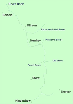 From its source at Beal Valley, it flows north through Shaw and Crompton in the Metropolitan Borough of Oldham, where Old Brook and Pencil Brook are tributaries. It continues north through Newhey and Milnrow in the Metropolitan Borough of Rochdale, before joining the River Roch at Belfield.