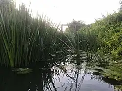 Several springs feed into the headwaters of the River Bourne and there are three contenders for its actual main source. It could be a spring on the North Downs at New House Farm, Yaldham, though the Environment Agency prefers a spring to the west of Oldbury Hill. It could be a spring on Oldbury Hill which feeds the Waterflash, a tree-ringed pond, which drains to the north of the hill. Oldbury Hill is on the Greensand Ridge. These merge in Ightham where the Bourne has cut a 117 feet (36 m) deep gorge through the limestone. In 1891 ice age relics were found near here in a quarry. The river passes through woods to Basted, where a mill pond gives clues to its industrial past. From Ightham through Hadlow to Golden Green, the river powered numerous watermills. Road names are full of mill references. The principal products were flour and paper. The area of the Medway Valley near East Peckham is prone to flooding and the River Bourne contributes much water, so is regularly monitored and dredged to ensure an uninterrupted water flow. There is a gauging station at Hadlow (TQ 632 497 51°13′23″N 0°20′17″E / 51.223052°N 0.338094°E).[3][4][5][6]