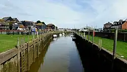 As the river passes to the north of Icklesham, the railway crosses to the north bank of the channel. Another pumping station pumps water into the river from a network of drains to the south of the river, which soon reaches Winchelsea. Large areas of the town are listed as a Scheduled Ancient Monument[25] Station Road, which leads to Winchelsea railway station, crosses the river at Ferry Bridge, and the A259 Royal Military Road, built in 1805 as part of the defensive Royal Military Canal crosses at Strand Bridge, on the eastern side of the town. Immediately beyond the bridge, the western section of the Royal Military Canal heads southwards towards Cliff End, near Pett. Like the town, it is an ancient monument.[26] The Saxon Shore Way long-distance footpath follows its eastern bank, and continues to the south of the river.[21]