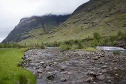 The River Coe (Scottish Gaelic: Comhan) rises at the north-eastern base of Buachaille Etive Beag in Scotland and flows west along Glen Coe. After dramatic waterfalls at the Pass of Glen Coe, it runs through the small Loch Achtriochtan before it turns north west. It then runs past the site of the Massacre of Glencoe and passes through Glencoe village, shortly before flowing into the sea loch of Loch Leven (a salt-water arm of Loch Linnhe) at Invercoe.[1][2]