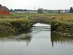 On the upstream side of the final bridge is a dam constructed across the river, which was part of the tide mill situated on the south bank of the river. The present mill building dates from the late 18th century, and is built of bricks with a red tiled roof. There is an opening in the dam, containing a pair of V-gates, which allowed the incoming tide to pass through them, but as the tide fell, the gates closed, and the impounded water was used to drive a water wheel. The building is now used as a warehouse and offices.[8] Just upstream of it is a former granary and drying kiln, built of red brick and dating from the early 19th century. It was associated with the tide mill, but has since been converted into a house.[9] Battlesbridge now contains a number of antique shops.[5]