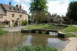 Crossing the B4068, the river joins the footpath known as "Warden's Way", that runs from Bourton-on-the-Water to Winchcombe and after a kilometre passes St Peter's, parish church of the small village of Upper Slaughter, as it encircles the village to the north and east. Turning south east, it descends into Lower Slaughter after another kilometre passing first under a former water mill. There was a mill listed on the site in the Domesday Book, and it continued to produce flour for the village until the death of the owner in 1958. It is now a shop and museum, housing the machinery of the former mill.[3] The river runs through the heart of the popular tourist village of Lower Slaughter, where it is commonly known as Slaughter Brook, forming a picturesque backdrop to the much-admired cottages of Cotswold stone.[4]