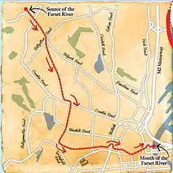 Rising on Squire's Hill on the north-western edge of Belfast, the River Farset is on the County Antrim side of the Lagan, and its entry to the Lagan is close to that river's outflow into Belfast Lough.[1][2] The Farset is now contained within a tunnel under Belfast's High Street supposedly big enough to take a bus.[3]