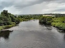 The Monellan Burn, also known as the Creamery Burn, flows into the River Finn very near a hamlet called The Cross, not far from the former site of Monellan Castle, just outside Killygordon.[2] From Castlefin downstream, the river is tidal, becoming deeper towards Strabane.[3] The Finn is 40 miles (64 km) long and together with its tributary the Reelin River, drains a catchment area of 195 square miles.[4] The River Foyle is formed by the confluence of the River Mourne and the River Finn, west of Lifford Bridge.[5] The area which the River Finn flows through is called the Finn Valley. The village of Clady, near Strabane in County Tyrone, is on the River Finn. The football club in Ballybofey, Finn Harps, is named after the river.[6]