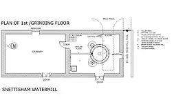 On the river at Snettisham stands a watermill TF68083346 52°52′21″N 0°29′45″E / 52.8724°N 0.4959°E. This was built in 1800 for £800 at a time when bread was scarce and it was built by the community of Snettisham for the people of the village. It is believed that the present mill was built on an existing site although virtually no records have so far been found apart from the fact that Thomas Stonne was a Snettisham miller in 1626. At the time of Domesday, there were seven mills in Snettisham more than in any other Norfolk village. Today's mill is very small and originally consisted of a single small structure built of local dark brown carrstone with a pantiled roof. In 1877, machinery was improved and a granary and wagon store were added to the complex. The mill had three pairs of stones and unusually the larger two pairs were driven from above and the smaller pair from below, the latter pair required less power and was used when water levels were low. The mill worked on until 1940 producing flour and after that was used for animal feed production until 1960. The mill was restored, and brought back to working order by 1984. It was sold in 2008, and a planning application lodged to part convert it to holiday accommodation.[2] Permission was refused. 1 September 2008.[3]